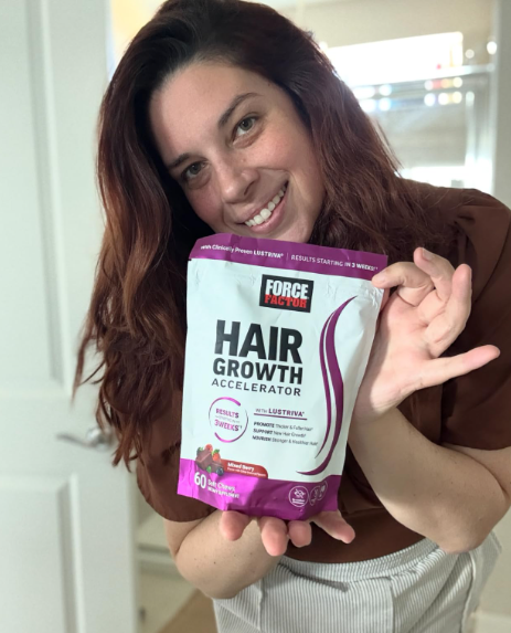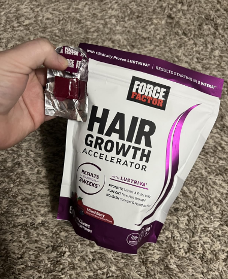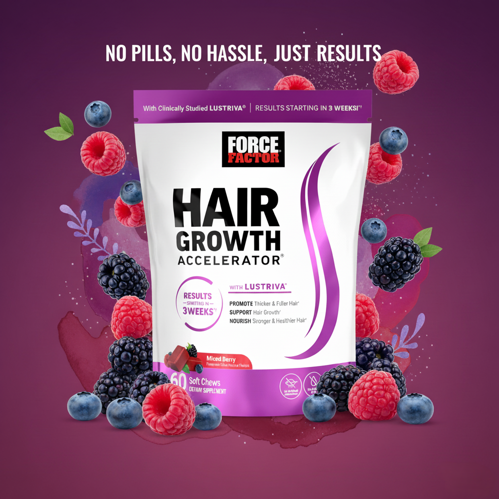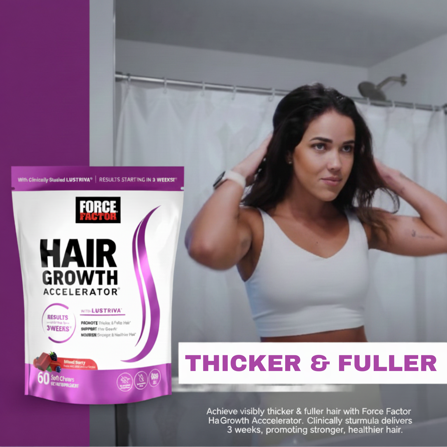 Force Factor Hair Growth Accelerator is a daily soft chew supplement that promotes thicker, fuller, and stronger hair. It features Lustriva®, along with Biotin, Vitamin C, and Vitamin E, to support healthy hair growth from within.